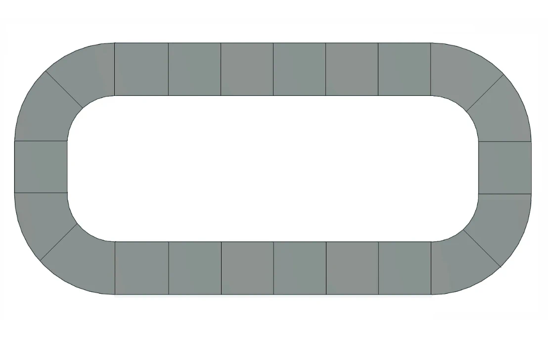 8 curved sections and 14 straight sections to create a large oval track. Includes 22 inside track connectors and 22 outside banked connectors.